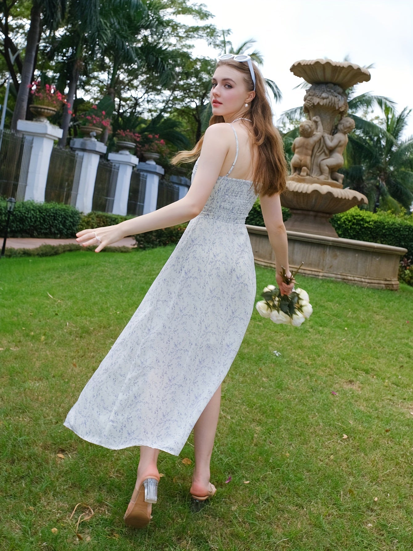 Elegantes Spaghettiträgerkleid mit Allover-Print – Geschlitztes, Rückenfreies Design