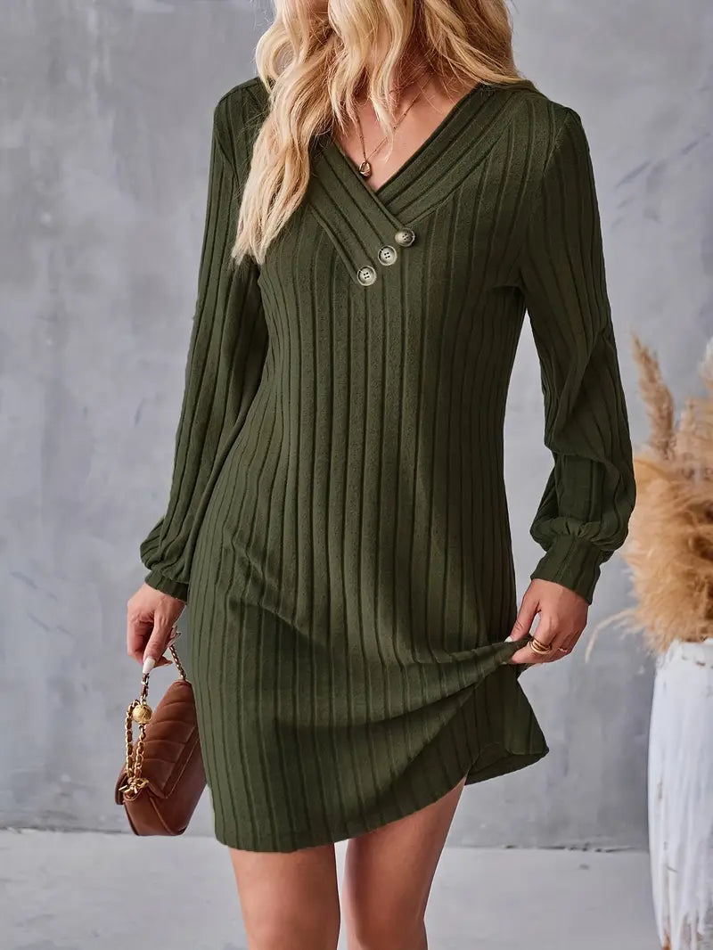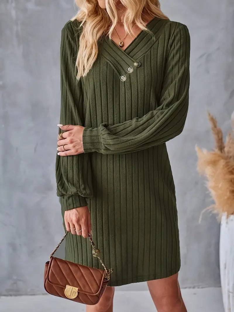 Winter Elegantes V-Ausschnitt-Rippenkleid – Langarm mit Knopf-Detail