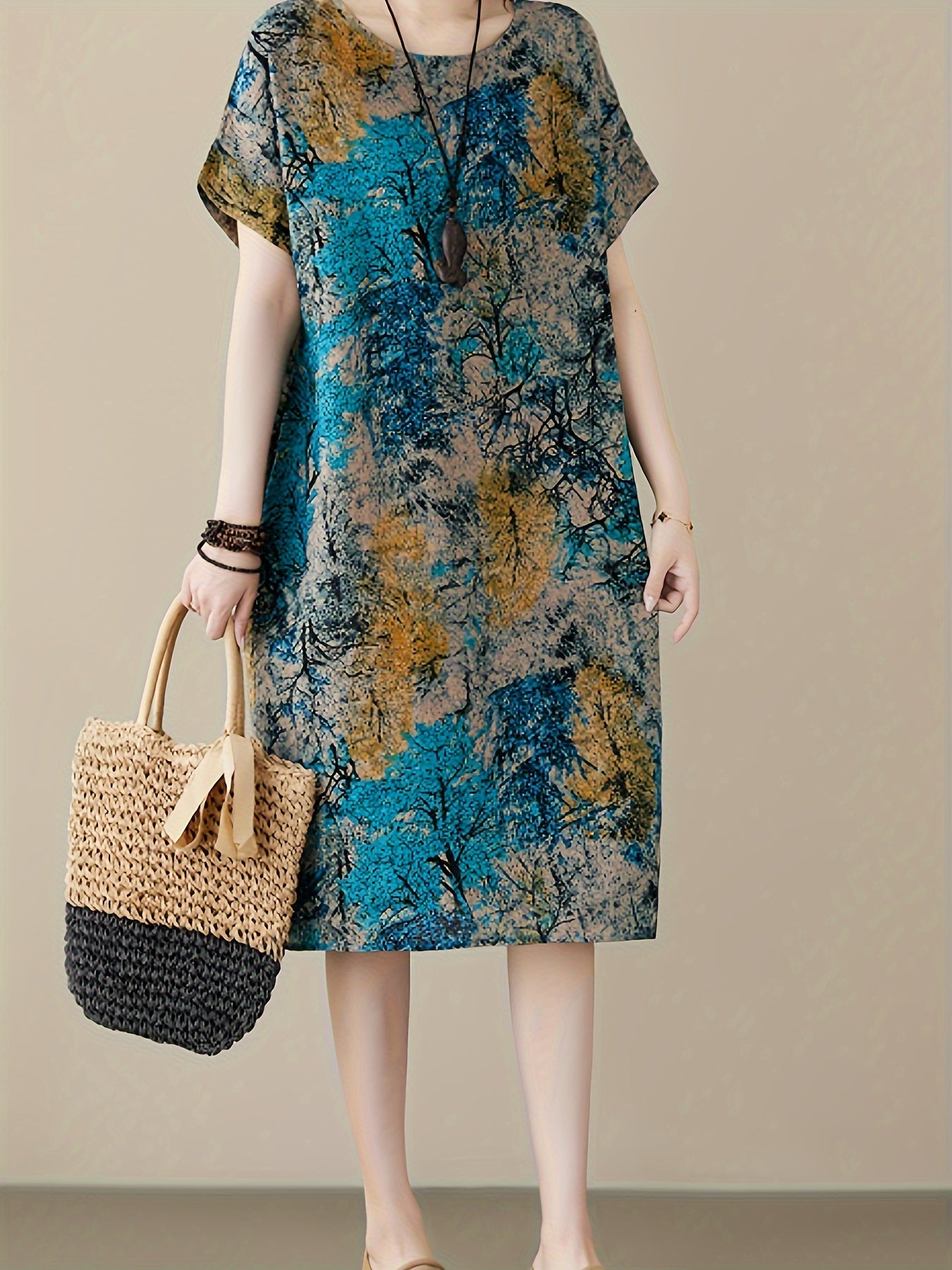 Lässiges Plus-Size Leinenkleid – Blumenkleid mit Rundhalsausschnitt & Taschen
