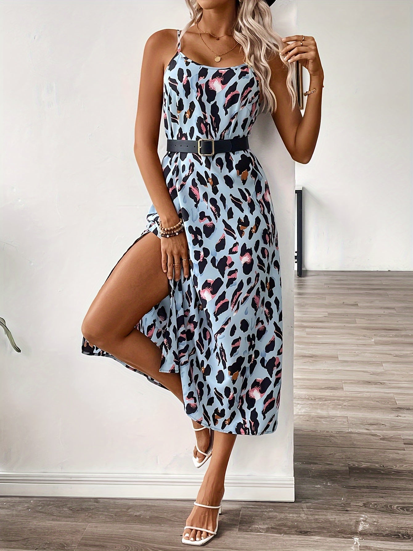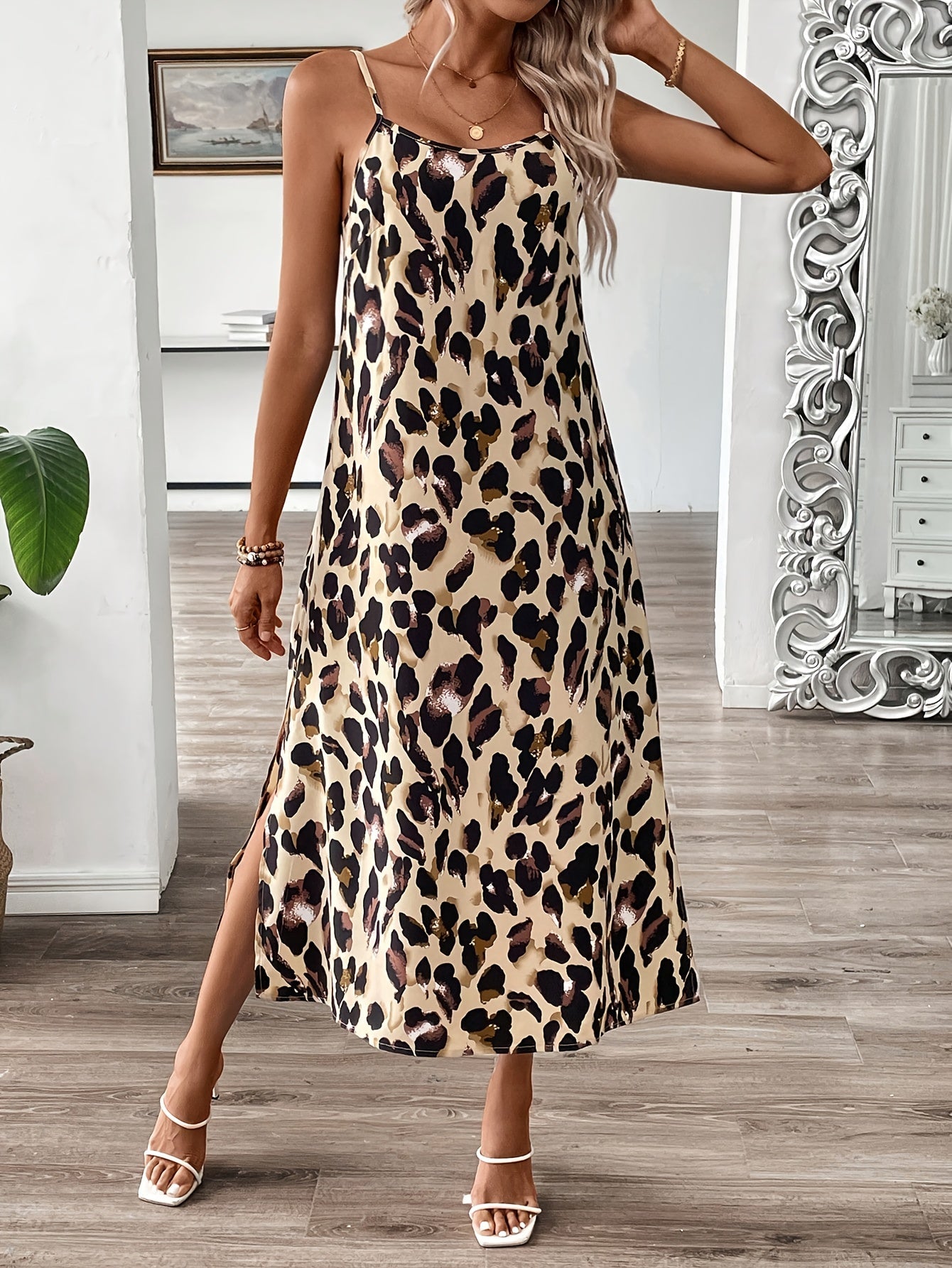 Leopardenmuster-Slipkleid mit Seitenschlitz und Spaghetti-Trägern